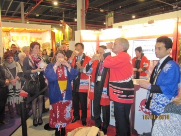 From 12 to 17 January, the Dutch Vacation Fair was held in Utrecht. On 16 January, at the Japan booth provided by the Japanese government, Ambassador Tsuji and the Mayor of Utrecht Mr Van Zanen made a speech, after which Japanese sake and sushi were distributed to the people who had come to watch. More than 120,000 people visited the Vacation Fair and our stand also received a lot of potential visitors to Japan.